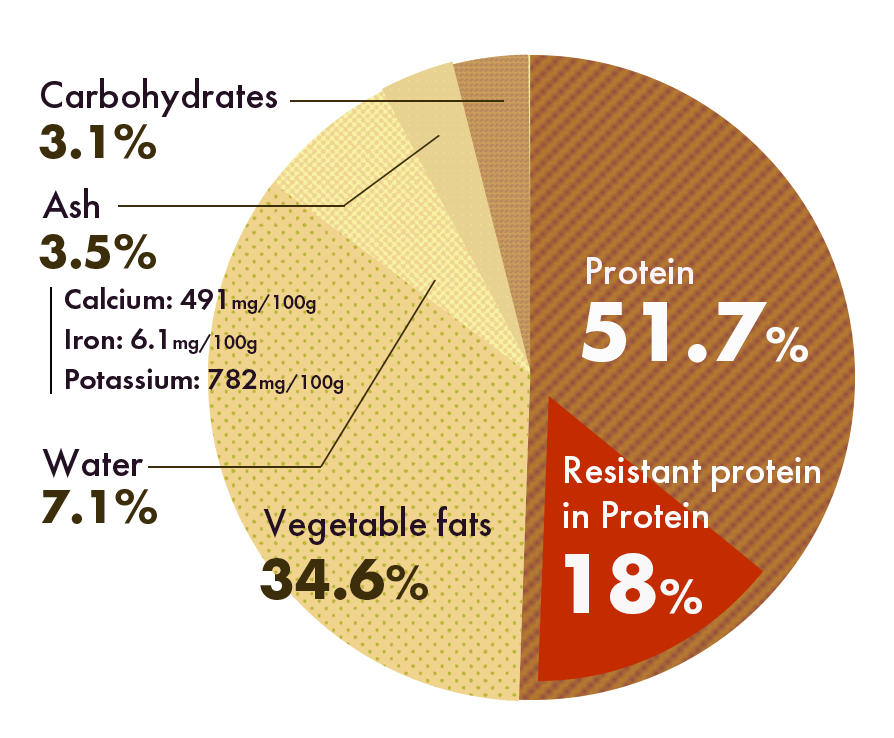 One of its most remarkable features is its high protein content: over 50% of its weight is plant protein (51.7g per 100g), including valuable soy proteins like glycinin and β-conglycinin.